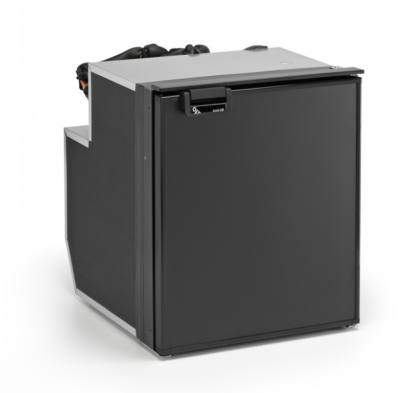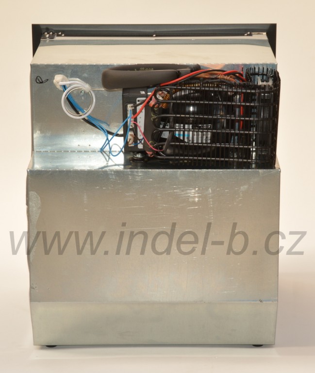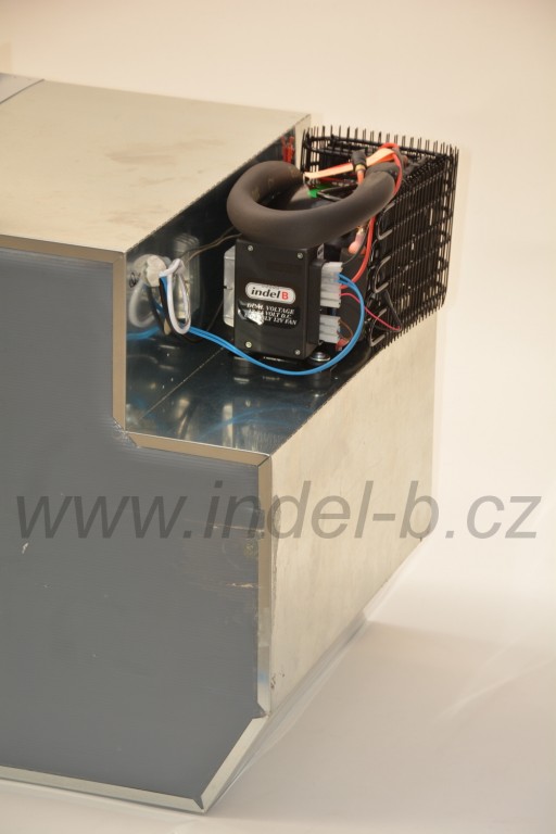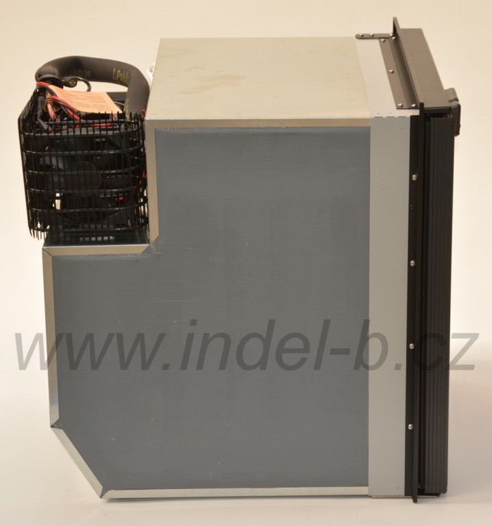 Vestavná kompresorová chladnička o objemu 65 litrů se vzduchem chlazeným kompresorem SECOP BD35F (dříve Danfoss) 12/24V umístěným vzadu nahoře.